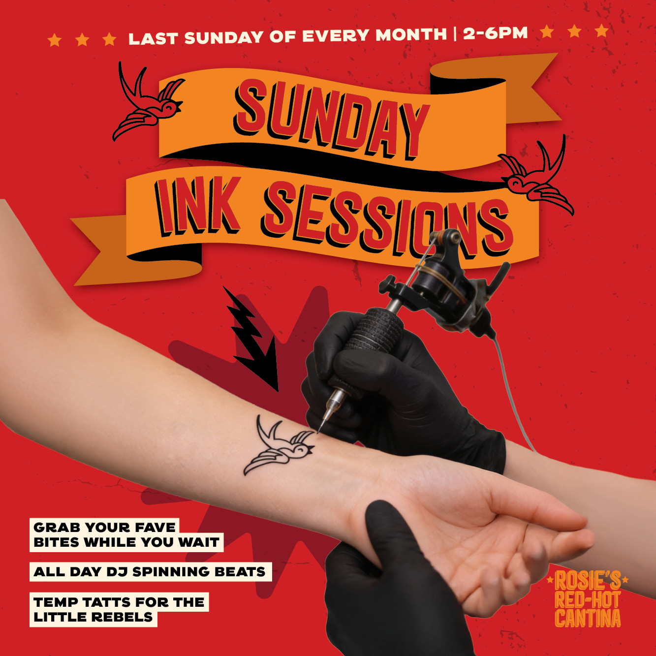 Tattoos are 18+, but little dare devils are welcome too - we’ve got Rosie’s-themed temporary tattoos for the kids.