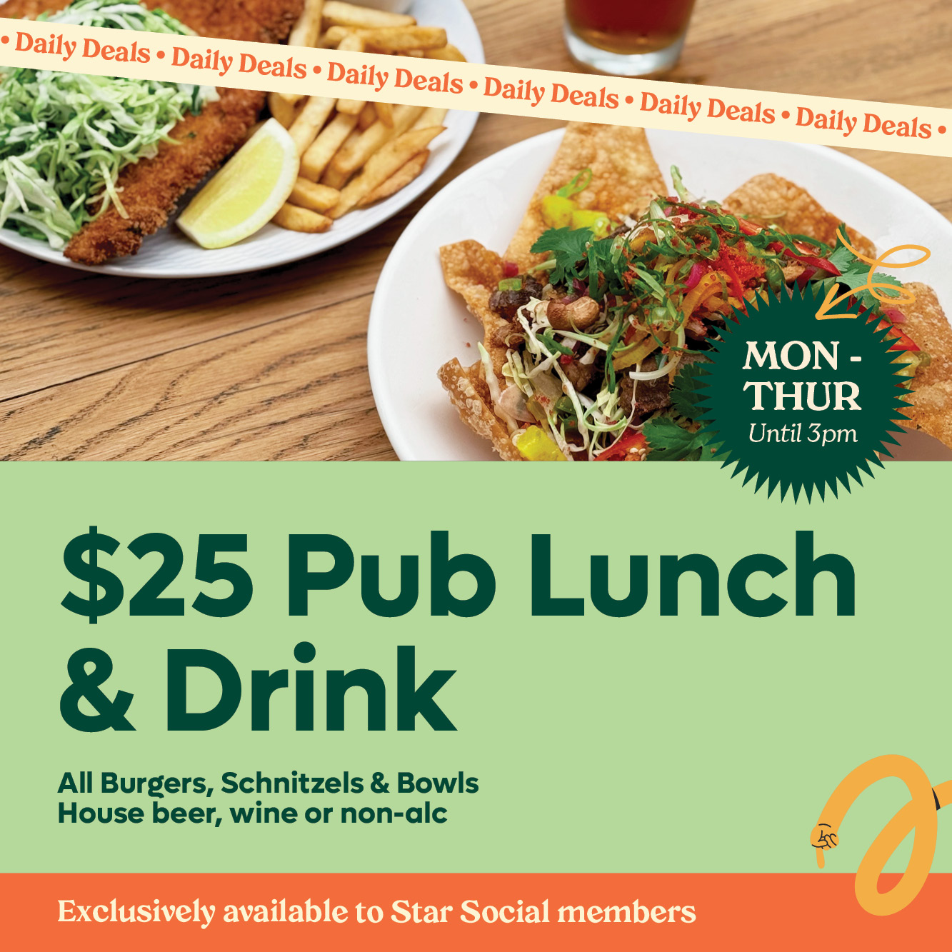 Offer available to Star Social members only, at participating Star Group pubs. Available on all menu items under the burger, schnitzel, & pasta sections at each participating venue. Excludes functions.